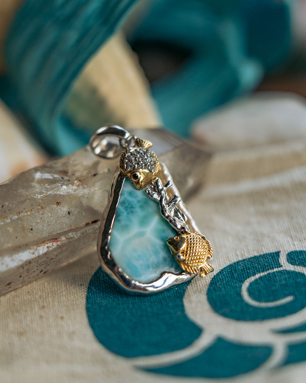 Larimar Necklace -Rectangle Larimar Pendant with 18K Gold Plated Fish & Coral